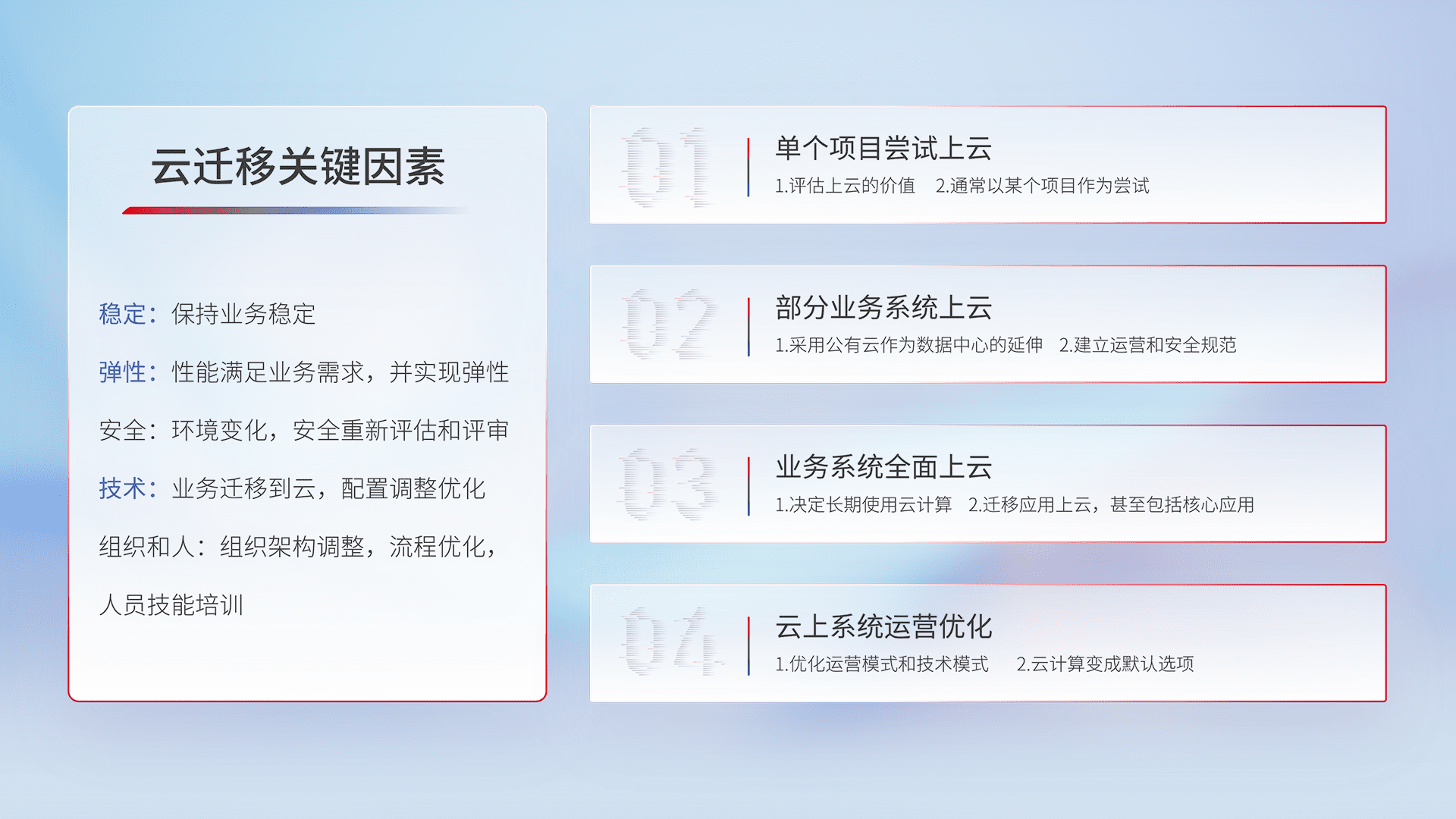 结合实际业务,,,从规划设计、、云平台选型、、、、云原生改造、、、、数据迁移、、、集成交付,,,,迁移全过程为客户识别最佳上云路径,,,做好风险识别管理,,,,设计网络架构、、身份权限、、、安全审计合规、、操作审计、、、日志审计、、监控告警策略、、多站点容灾设计等,,,,对云上基础设施进行整体规划,,提升IT治理水平,,以满足弹性、、高可用、、、高性能的需求。。。