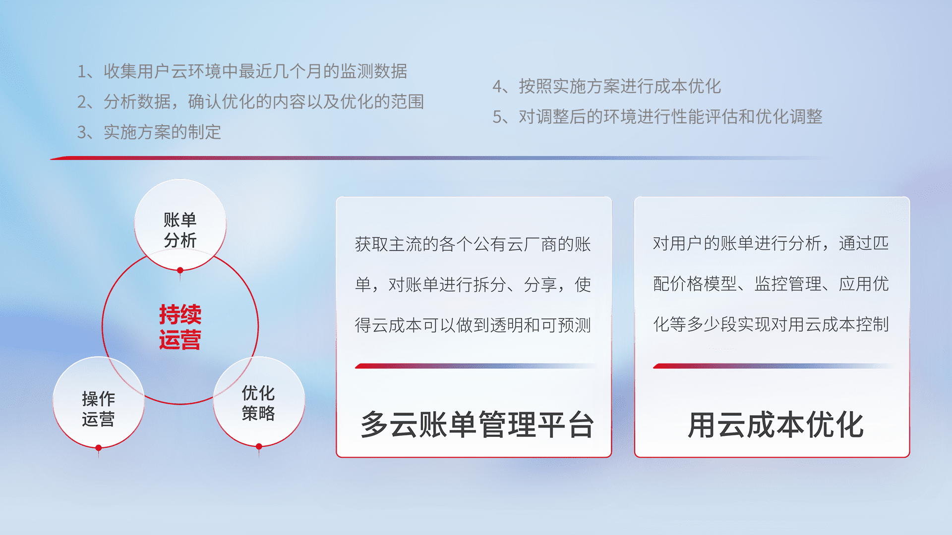 通过多云纳管,,,以统一的资源数据模型把客户的云资源进行抽象和封装,,进而实现对多云资源的统一操作,,,,保障云资源管理的可靠性、、、、稳定性与可用性。。。量身定制化运维内容,,,,配置、、开发运维、、补丁管理、、备份、、、、监控、、认证和访问管理、、、、审计和日常巡检等,,,,保障在用云过程中的可靠度,,,稳定度以及高可用率。。