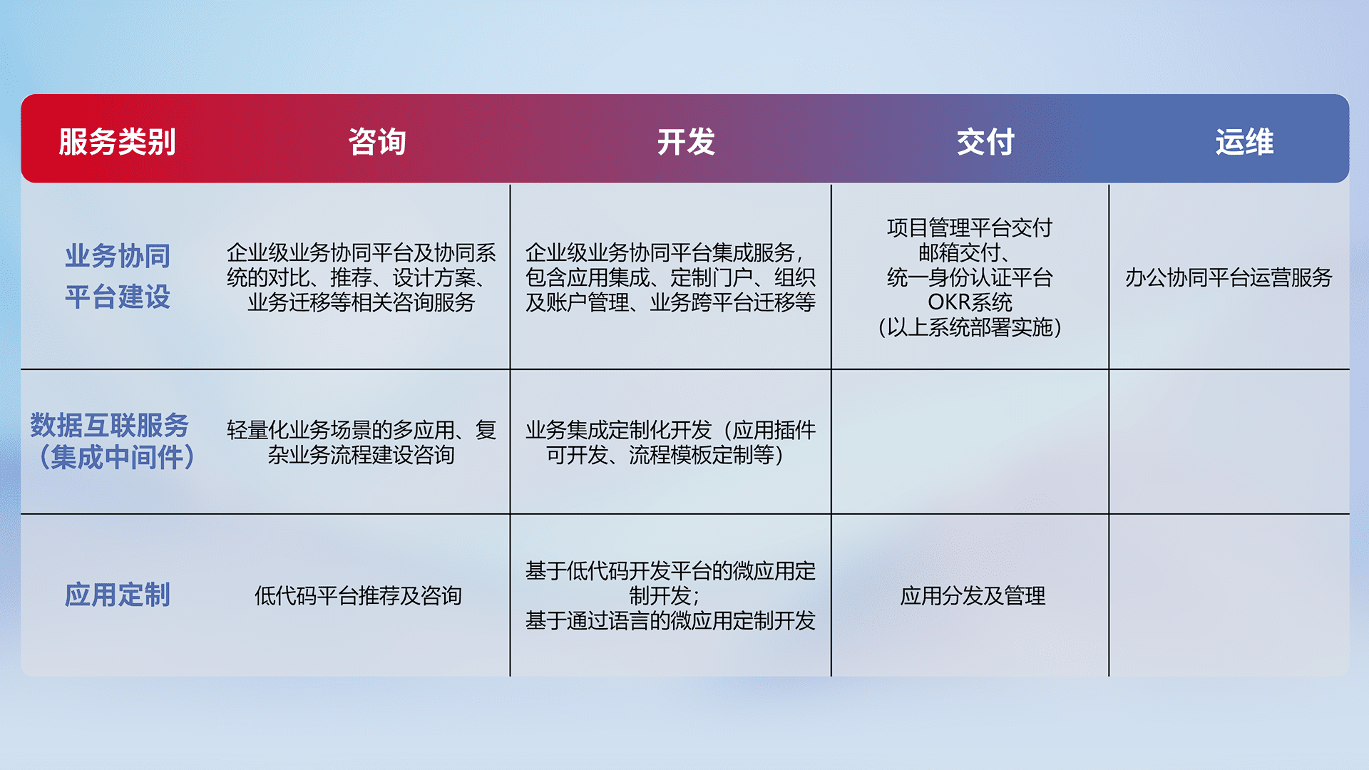 针对钉钉、、、、企微、、IDaas等平台级产品提供产品的规划、、、方案、、交付、、定制化开发等服务,,实现如统一协同办公、、智能客户服务、、、混合会议管理、、、、智能数据查询、、、等业务场景,,,实现数字化转型。。